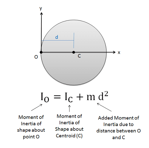 where Icm is the moment of inertia about the center of mass, M is the total mass, and d is the distance between the two parallel axes.