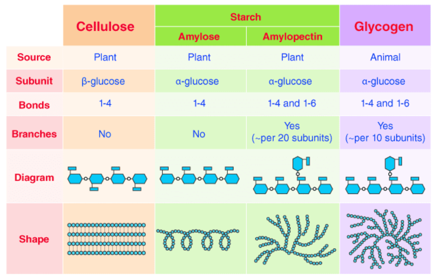 - Glycogen: Animal energy storage, highly branched for quick glucose release