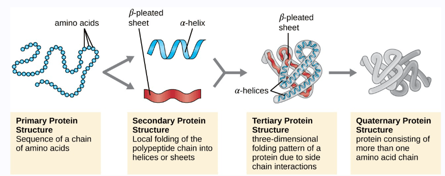 Primary Structure: The linear sequence of amino acids, determined by DNA. Change even one amino acid (like in sickle cell anemia), and you can change the entire protein’s function.