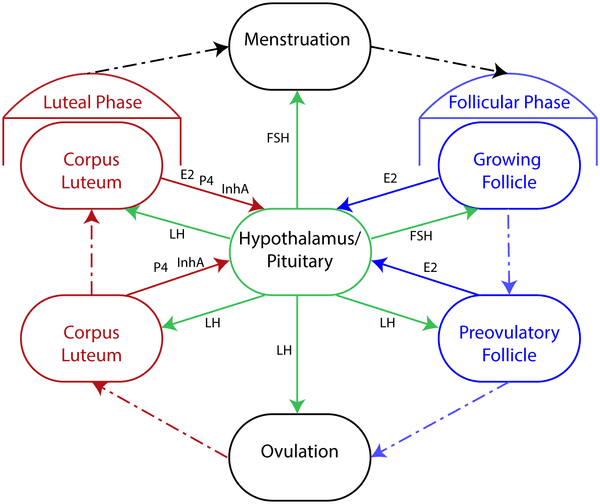 - GnRH → FSH/LH → Estrogen/Progesterone → Target Effects