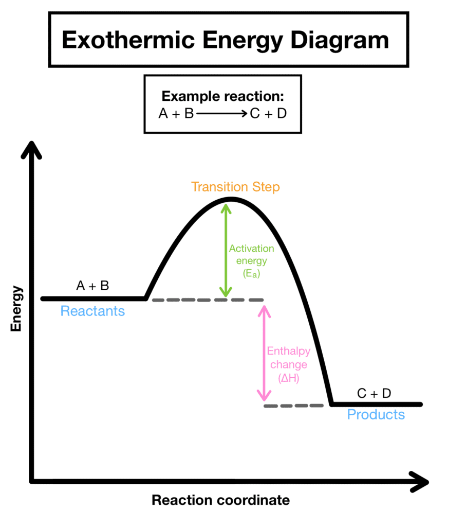 - Exothermic: ΔH < 0 (negative), releases heat, products lower in energy